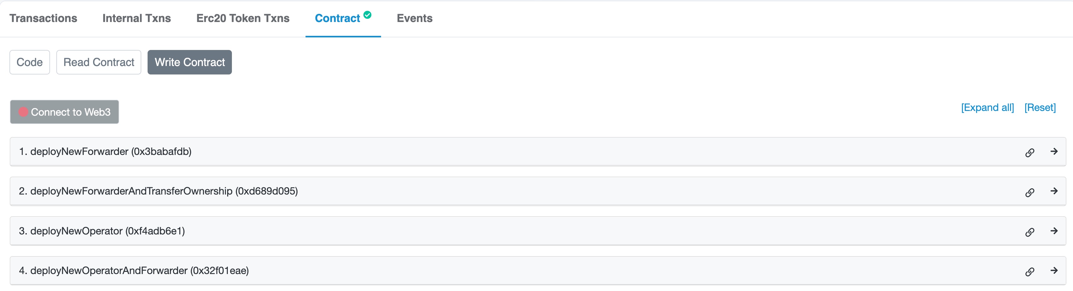 • The owner of a forwarder contract is an operator contract. The owner of the operator contract is a more secure address, such as a hardware wallet or a multisig wallet. Therefore, node operators can manage a set of forwarder contracts through an operator contract using a secure account such as hardware or a multisig wallet.