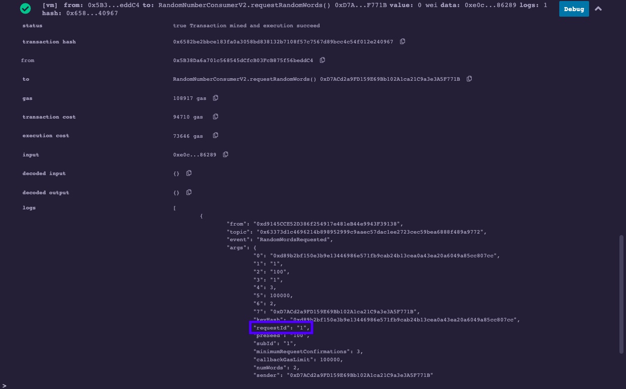 3. In the RemixIDE console, read your transaction logs to find the VRF request ID. In this example, the request ID is 1.